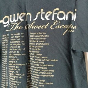 Gwen Stefani The Sweet Escape Concert T Shirt. Features a double sided graphic print, one with Gwen and the back with the dates if the tour. I got this when she was at the shoreline amphitheatre in mountain view CA. It is a distressed Black, short sleeves and 100% Cotton.