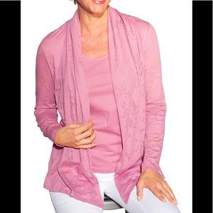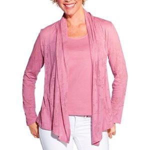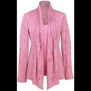 Shadowy, burnout effect gives subtle pattern and texture to this soft cotton/polyester knit Floral Burnout Cardigan and Tank Set. Flowing shape with shawl collar and draped, open front. Pairs perfectly with our solid tank. Sheer burnout long sleeve tunic jacket with shawl collar and solid lilac tank. Perfect spring set. Jacket is lightweight fabric so it is the perfect warm weather layering piece. Approx. 26"l Never worn but without tags.