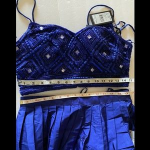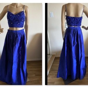Blow them all away in a contemporary ballgown designed as a dramatic two-piece ensemble. Begin with gorgeous, sparkling beadwork on the sleek cropped bodice that tastefully reveals a bit of skin. Then get lost in the lustrous taffeta of the voluminous, floor-length ball skirt.