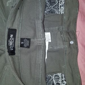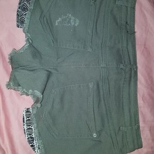 Super cute army green destructed denim jean shorts. cutoffs with black and white tribal pocket design. Zipper and bitton closure. 4 functioning pockets. Brand new without tags. Size 9 stretch.