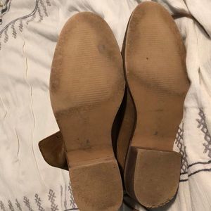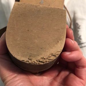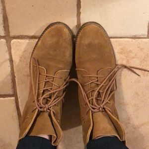 Steve Madden Rosaly suede boots! These booties have a 1.5 inch stacked heel and very minimal wear, the only notable sign of wear is on the heel of the left boot and the price reflects the flaw. They have very long laces and can be looped around the neck of the boot if desired. Size 8 but fits more like a 7.5
