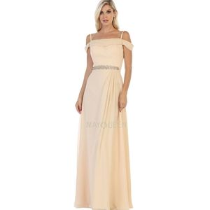Chiffon off the shoulder dress with beaded embellishment and drape back. Sizes 4 6 8 10 12 14 16 18 20. Please see highlighted sizes in the photos section and check the bust,waist and hip measurements for your size. Colors are burgundy, champagne gold,dusty rose,mauve, and navy blue. Price is firm. When you order it please put the color you want in the comment section.