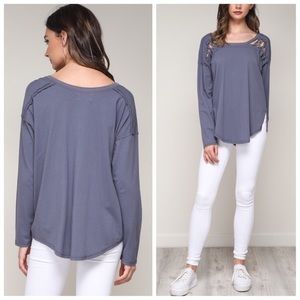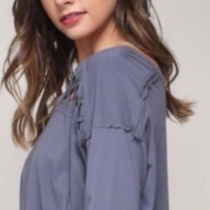 Get this beautiful blue long sleeve tunic top with unique tie lace up shoulder detailing and side splits @ bottom. This top can be dressed down or up. Very versatile! Update your closet now❣️