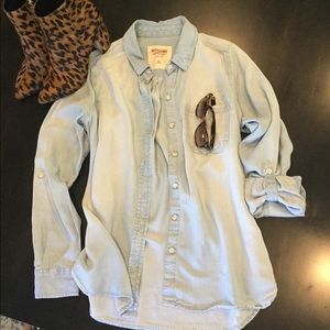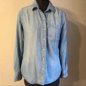 Super soft chambray denim button down shirt, excellent condition! Sleeves roll up with buttons to tack them in place. Very cute top!
