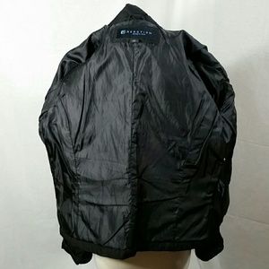 Kenneth Cole Reaction black down jacket with two side zipper pockets and one inside pocket. Warm and comfortable. There is some fabric fraying on the top left back and tiny bits of the down is coming out at various parts of the seams throughout (see pictures for details).