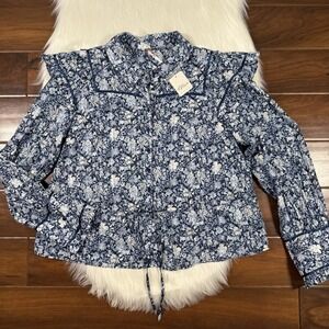 Haley & The Hound Womens Size Large Aqua Blue Shrimp Print Stella Top, Button Up, 100% Rayon, No Stretch, Long Sleeve with Elastic Arm