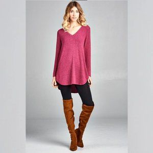 Super Soft High Quality Two-Tone Hacci Brush V-Neck Tunic Top with Side Curved Hem Detail.