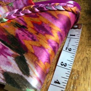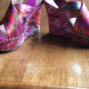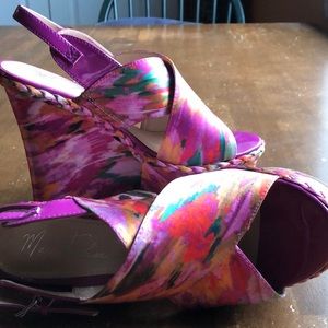 Marc Fisher beautiful pink and purple multi-color platform shoes. These are 5 inch platforms but extremely comfortable. Bright vibrant colors of pink, purple, red, gold, platform is of same material. Shoe has a back strap so easy to slip on and off. We have been lovingly worn and are still in very good condition!
