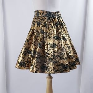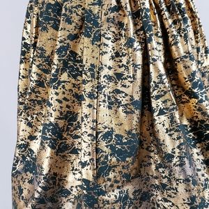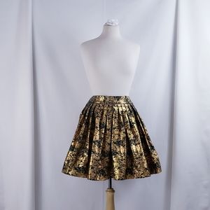 100% cotton skirt w/ gold metallic finish, hidden pockets (see last two photos for pocket detail), elastic (rear) waist. Crisp, full skirt. Fabric pre-shrunk before garment constructed. Wash delicate, or by hand, do not twist or wring, lay flat or hang to dry. Being sold directly by indie designer. Only one made. Only one available.
