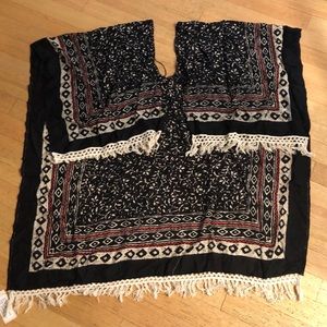 NWOT. Black, tan, red, cream. Cotton/silk. Measures 62” long by 40” wide. Super cute cover up. Can also be paired over rank or tee. Sides are open and have no stitching or arm hole. Feel free to ask any questions😊