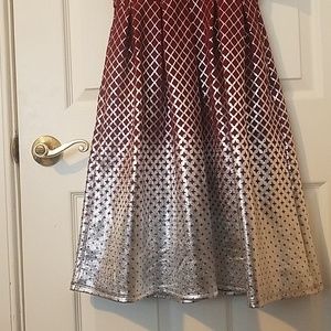 A party dress with pockets! Berry Red and Silver ombre effect. Zipper back, slight puff on the sleeve. Size small, fits true to size. New with tags. Not a seller, just a compulsive buyer with too many dresses.