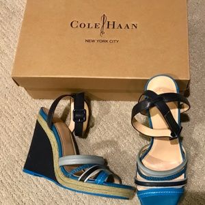 Navy, royal and light blue wedge sandals with fabric heel and jute trim. Very pretty, barely worn.