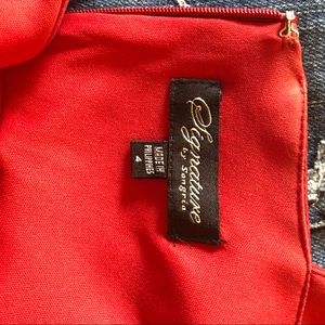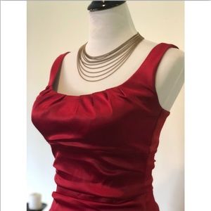 Super flattering formal red dress. Goes just below the knee and has great rouching around the mid section.