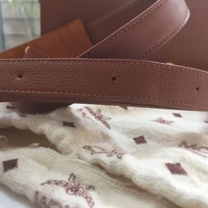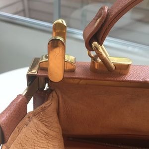 This camel colored leather bag w/gold hardware is in great vintage condition. There are a few scratches on hardware, minor scuff marks on the body, and a small stain on the inside of the inner zippered pocket (see photos). It slumps a bit when sitting, due to being stored in its original dust bag in my closet for a few years. There are 2 small creases in the strap where the buckle has been. Original key/strap/dust bag included. 11"L x 6.5"W x 8.5" tall (when open). Reasonable offers considered.