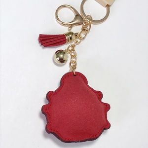 Puffed Rhinestone Ladybug Purse Charm Key Chain This beauty sparkles like crazy and has a soft faux suede back so it will not scuff your bags! Red, white, and black rhinestones sparkle on the front, back is a red faux suede. Gold tone hardware on key ring, chain, decorative ball and lobster claw clip. Red faux leather tassel. Overall drop is approx 6”. Meas approx 2-1/2” w x 2-3/4” h