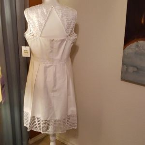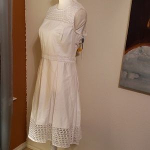 The dress is white and inside from the structure there are some black lines. The same thing happened to another dress I owned. It does not show through the front. There is something odd that happens with some white Calvin Klein dresses, inside gets some black spots but they do not show through.