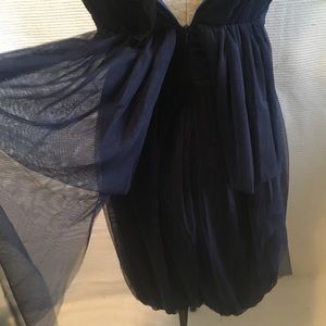 Boning in corset top, sweetheart neckline, defined waist, bubble hem. just below knee. navy blue.