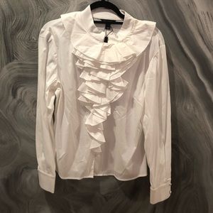 This cream colored tank top has long fringe that hangs from each corner. Layer it under a blazer or just wear with wide leg pants the super versatile top can even be worn over a turtleneck with the scarf in the winter very fashion forward was purchased from La Garçonne