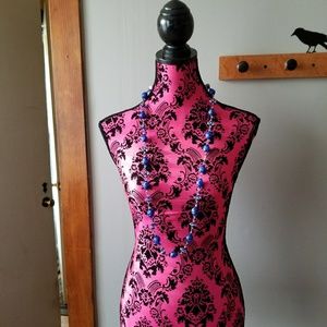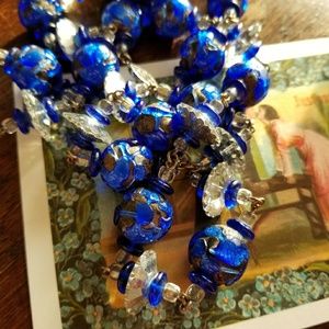 It has big Art Glass beads with cobalt blue color freeform glass on a dark background. There are silver tone glass saucer beads, all spaced with little glass beads. No clasp, slips on over your head. This necklace is in nice preloved condition and are from a smoke free home:)