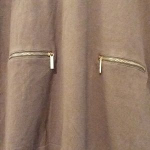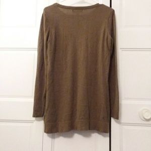 This sweater is perfect for business or paired with jeans. The gold zipper dual pocket "appearance" on the front gives if that little piece of pop that make this piece special. Olive green color.