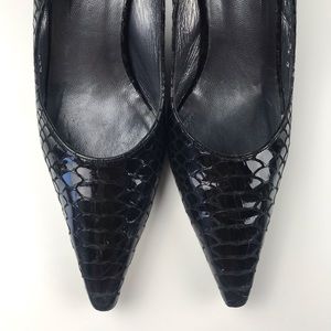 *Snake skin textured leather upper and leather soles / Black color / Pointy toe / Adjustable straps