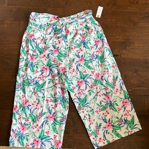 Brand new 2 piece pajama set . Capri pants and top . Pants have elasticized waist and Functional drawstring.