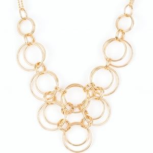 Brushed in a glistening shimmer, gold rings link together below the collar, creating a bold interlocking pendant. Features an adjustable clasp closure.