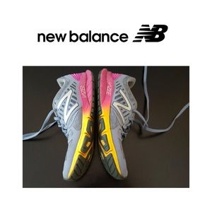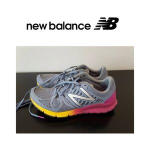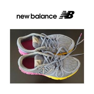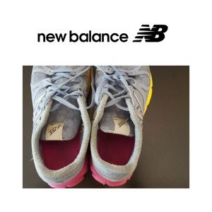 These are a good condition pair of running shoes from New Balance. They are the Vazee style running shoes in a women’s size 8. They are a blue-gray color and have pink and yellow trims and a flexible sole for comfort while you run.