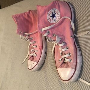 Pink dyed converse I dyed these myself Light pink high top converse. They are worn (price is accordingly) still have a lot of life left Super cute with mom jeans :) Men’s 8.5 woman’s 10.5 I’m a 9.5 and they fit fine though