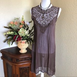 Beautiful Mocha Colored Silk Tank Shift Dress with Lace Neckline, Trimmed with Lace On Arms And Hem, No Lining