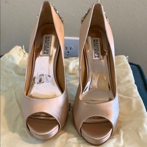 Badgley Mischka blush satin nude heels with beautiful jewels on the back. Open toe. Never been worn. Dust bag included. Size 8