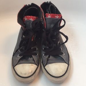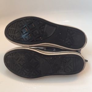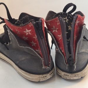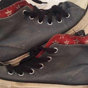 Has scuffing on toe area & heel area of rubber sole has worn down a little. Outer sides of gray canvas have either discolored a bit or just need to be laundered. Otherwise, in good used condition. Please view all photos. Priced accordingly.
