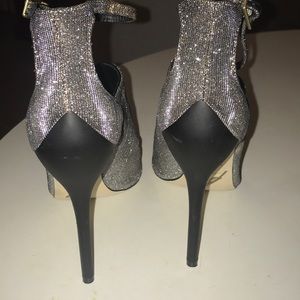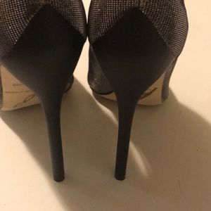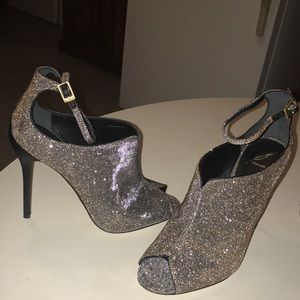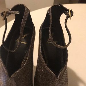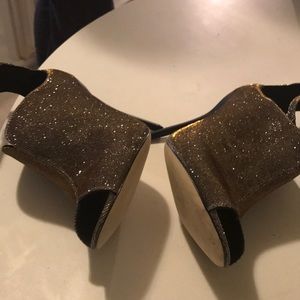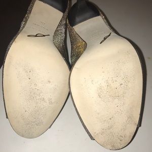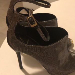 Shimmering gold, silver & black iridescent canvas. Slim ankle straps. Gold tone buckle. Peep toes. slim 4’ heels. Leather lining & soles. No Knick’s on heels. Minor scratches. Incredibly captures sexiness style chic & comfy. Complimentary foot wear. Only worn once.
