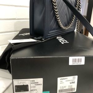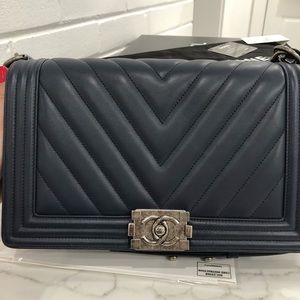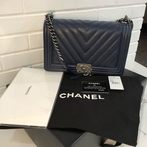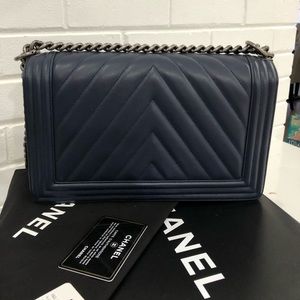 Pre owned beautiful navy blue chevron chanel boy bag. Comes with: box, dust bag, authenticity card. Condition 8/10. Used a handful of times. Open to offers.