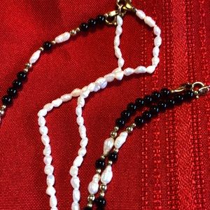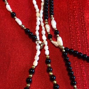 1 primarily black bead with freshwater appearing pearls and gold tone beads with matching bracelet. The bracelet is 6 inches and the necklace hangs 7.25 inches. The 2nd necklace is primarily freshwater appearing beads with black and gold tone beads that hang in the lowest position. This necklace hangs longer at 8.5 inches. All new yet old in the jewelry box!!