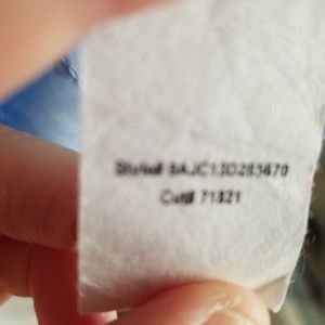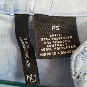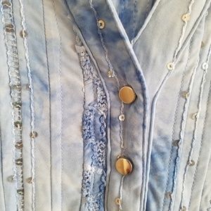 New Directions Petite - Blue with Sequins Sleeveless Blouse. Has mock collar and 3 silver buttons down front. In very good condition, gently used.