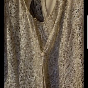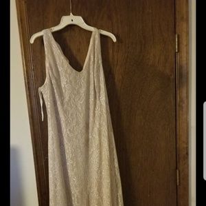 Dress is a size 2X fabric is stretchy and comfy. It's champagne in color and the dress is sleeveless with a long sleeve jacket