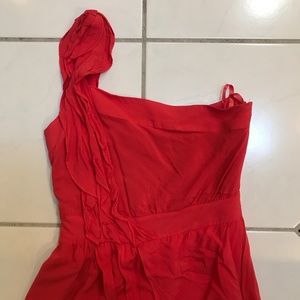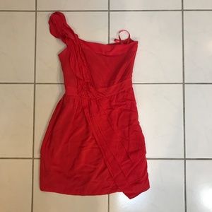 BCBG reddish/coral mini dress. One strap with ruffled details. Size 0 but runs small. Worn once, perfect condition, just needs to be ironed!!