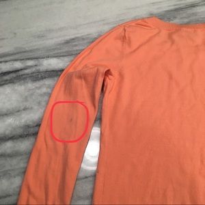 Gently used condition. Beautiful light orange or sherbet colored lightweight sweater with clear “aurora“ crystals all over the front of it. This bling will reflect multiple colors in them. There is a small mark on the back left elbow.
