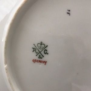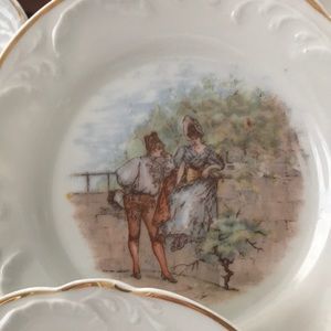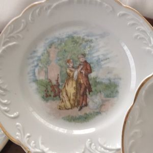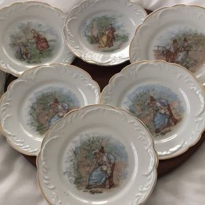 6 porcelain dessert plates. 6” dia. 4 different transfer patterns. Gold rim. Good condition