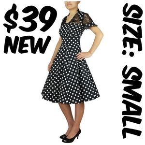 Pin up retro swing dress. Buttons and pleats at bust. A slim removable belt ties at waist. Side seam pockets. The petticoat is not included.