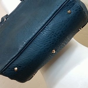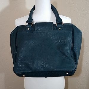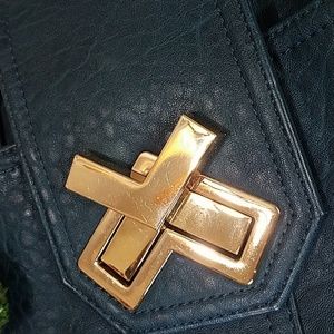 Gently used dark teal vegan leather satchel from brand Deux Lux. Lined in heavy canvas with an inside zip pocket and two pouch pockets. Large outside pouch pockets on either side. Gold medal clasp on front spins around to open.