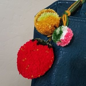 Used, but no stains, rips, or scuffs that I could find, except some minor wear on the clasp. Was only carried a couple of times. Comes with fruit pom-poms, made by me.