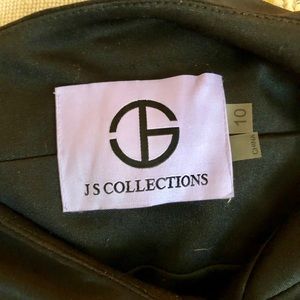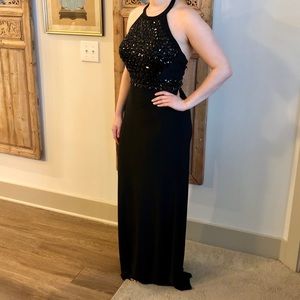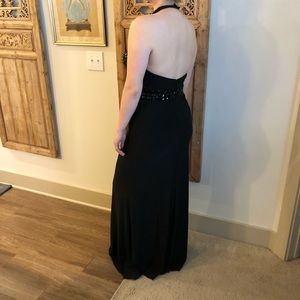 Black form fitting halter formal gown with beading around waist line and bodice, gently worn