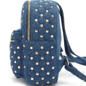 NWT, cute denim backpack featuring a quilted design, allover studded accents, zip top closure, front zip pocket, and adjustable shoulder straps. - Height: 10" ,Width: 8",