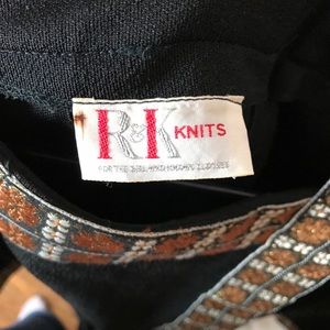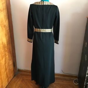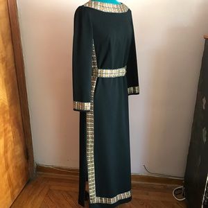 Vintage stunning belted black column boat neck knit dress fit for a goddess! This dress has copper jacquard detailing at collar and along sides, cuffs of long sleeves and hem that matches the snap on belt. Small slit on side.