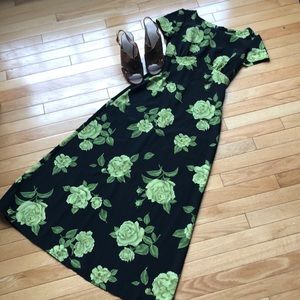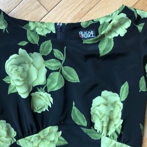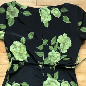 Super cute vintage 90s black and green floral dress in excellent used condition. Fabric is 100% polyester and has a metal zipper in the rear. There are no pockets and it is unlined. Tied in the back at the waistline.