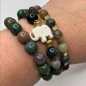 Handmade by kathrynrdesign. Set of 3 stretch bracelets. Stone beads with howlite elephant focal bead. Gold accents with dark greens, browns and plum. Pics don’t do them justice. Very nice set!