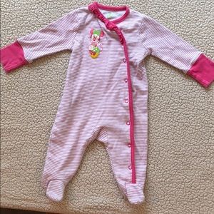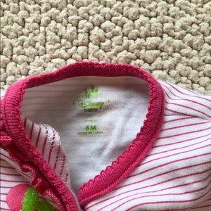 Size 6 month sleeper with Minnie on the front by Disney brand. Pink and white stripe with solid band at the wrists. Gently used.