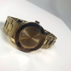 Midsize Movado BOLD watch, 36 mm yellow gold ion-plated stainless steel case, K1 crystal with a ring of highly reflective yellow gold-toned metallization, yellow gold-toned sunray dial with clear crystal-set dot and yellow gold-toned hands, yellow gold ion-plated stainless steel link bracelet with deployment clasp.
